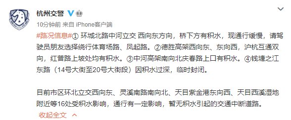 目前市区环北立交西向东、灵溪南路南向北、天目紫金港东向西、天目西溪湿地附近等16处受积水影响,通行有一定影响,暂无积水引起的交通中断道路。
